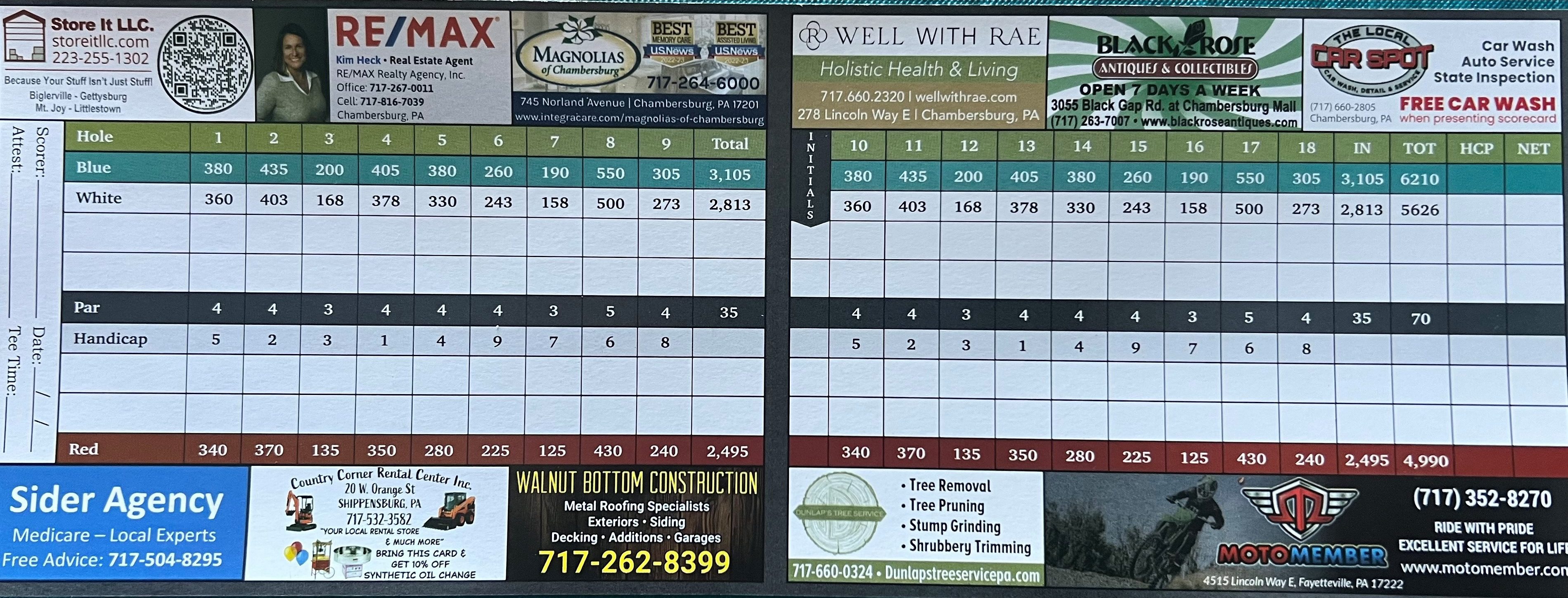 Conocodell Golf Club is a 9-hole, par 35, course with two par 3's, six par 4's, and one par 5. There are three tee sets, making the course range from 2,495 to 3,105 yards and tee shots range from 125 to 550 yards. The course features flat terrain, the Conococheague Creek runs throughout, strategically placed sand traps, and the greens require accuracy.
